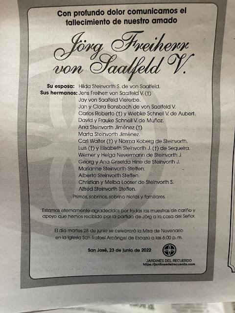 Earlier this week, Baron Jörg von Saalfeld (don Jörg Freiherr von Saalfeld Viererbe) died at San José, Costa Rica. He was eighty-five years-old. A funeral mass will be held on 28 June at the Iglesia San Rafael Arcángel in Escazú.