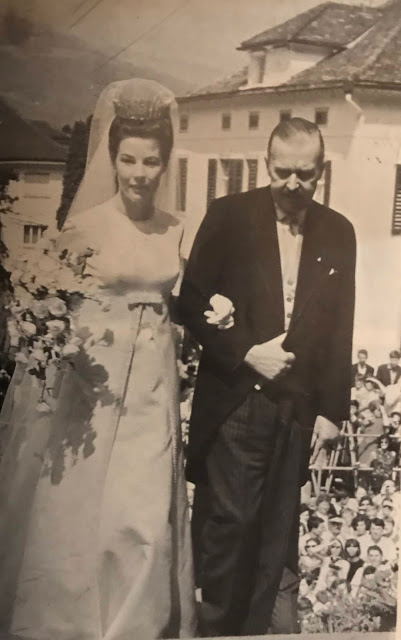 The then Hereditary Prince Hans Adam of Liechtenstein (b.1945) and Countess Marie Agläe Kinsky von Wchinitz und Tettau (b.1940) were wed at St Florin’s in Vaduz on 30 July 1967. Hans Adam is the eldest son of Prince Franz Joseph II of Liechtenstein (1906–1989) and his wife Princess Georgina (née von Wilczek ;1921–1989). Marie Agläe is the daughter of Count Ferdinand Kinsky von Wchinitz und Tettau (1908–1969) and his wife Countess Henriette Caroline (née Ledebur-Wicheln; 1910–2001). Hans Adam and Marie Agläe are second cousins once removed through their descent from Fürst Ferdinand Kinsky von Wchinitz und Tettau (1834-1904) and his wife Princess Maria Josepha of Liechtenstein (1835-1905).